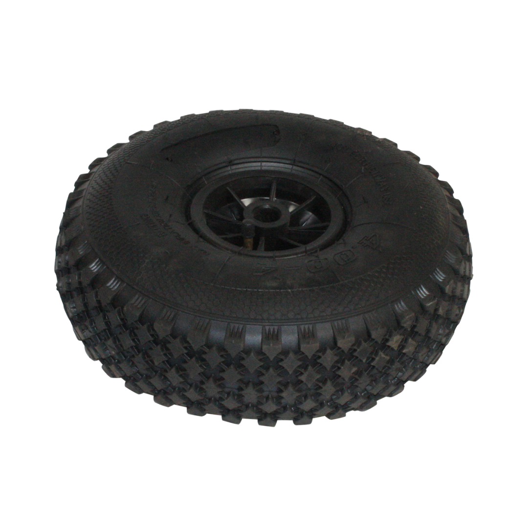 Originalt Baron luftgummihjul i Ø410 med stor diameter, der sikrer optimal fremkommelighed og stabilitet ved transport af transportbånd – selv på ujævnt og blødt underlag som grus, jord og byggepladser.