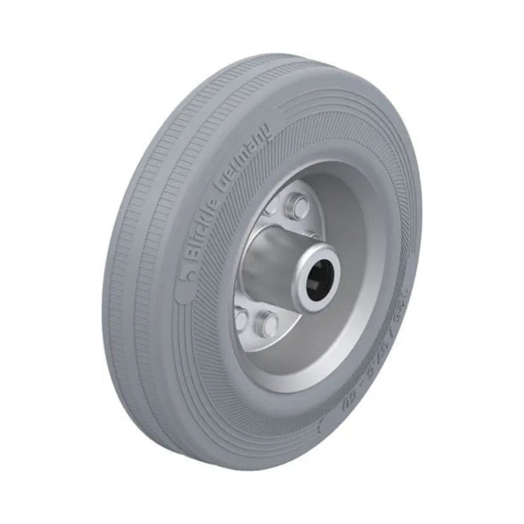 Den grå gummibane gør hjulet særligt velegnet i miljøer med krav til rene gulve, eksempelvis i produktion, lagerhaller og værksteder.