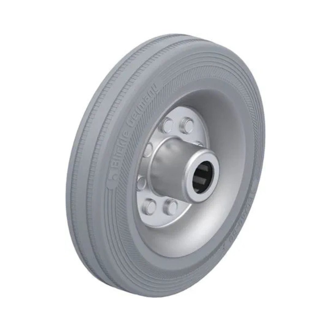 Den grå gummibane gør hjulet særligt velegnet i miljøer, hvor der stilles krav til rene gulve, eksempelvis i produktion, lagerhaller og værksteder.