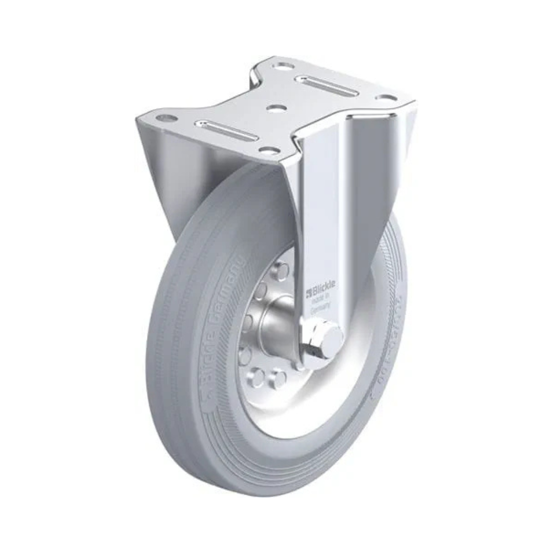 Dette transporthjul med fast gaffel er designet til transportvogne, lagerudstyr og andet internt transportmateriel, hvor der er behov for stabil og retningsfast kørsel. Den grå massive gummibane er afsmitningsfri og sikrer støjsvag drift samt effektiv vibrationsdæmpning, hvilket gør hjulet velegnet til miljøer med krav til rene gulve.