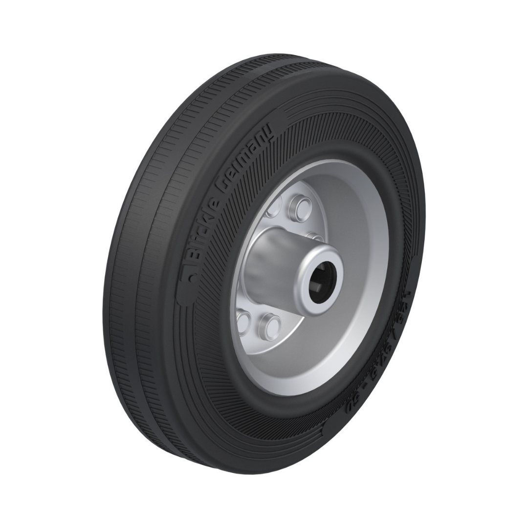 Slidstærkt transporthjul i massivt standardgummi til alsidige opgaver med lette og mellemtunge belastninger. VE 125/12R er særligt velegnet, når der ønskes god vibrationsdæmpning kombineret med støjsvag drift.