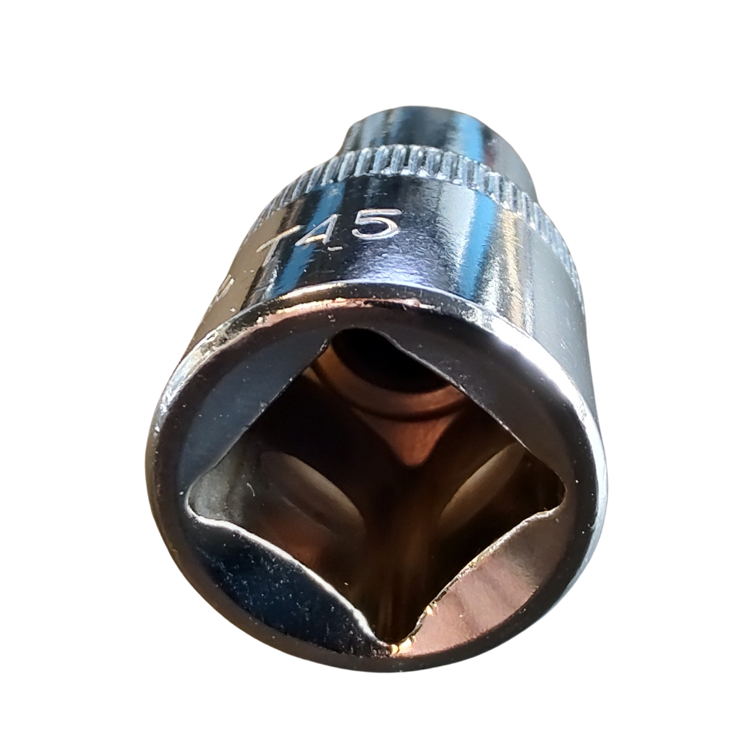 Robust Torx-topnøgle med TX45-profil og 1/2″ indvendig firkant til brug med skraldenøgle eller momentnøgle. Egnet til professionel brug i industri og værksted, hvor præcision og holdbarhed er afgørende.