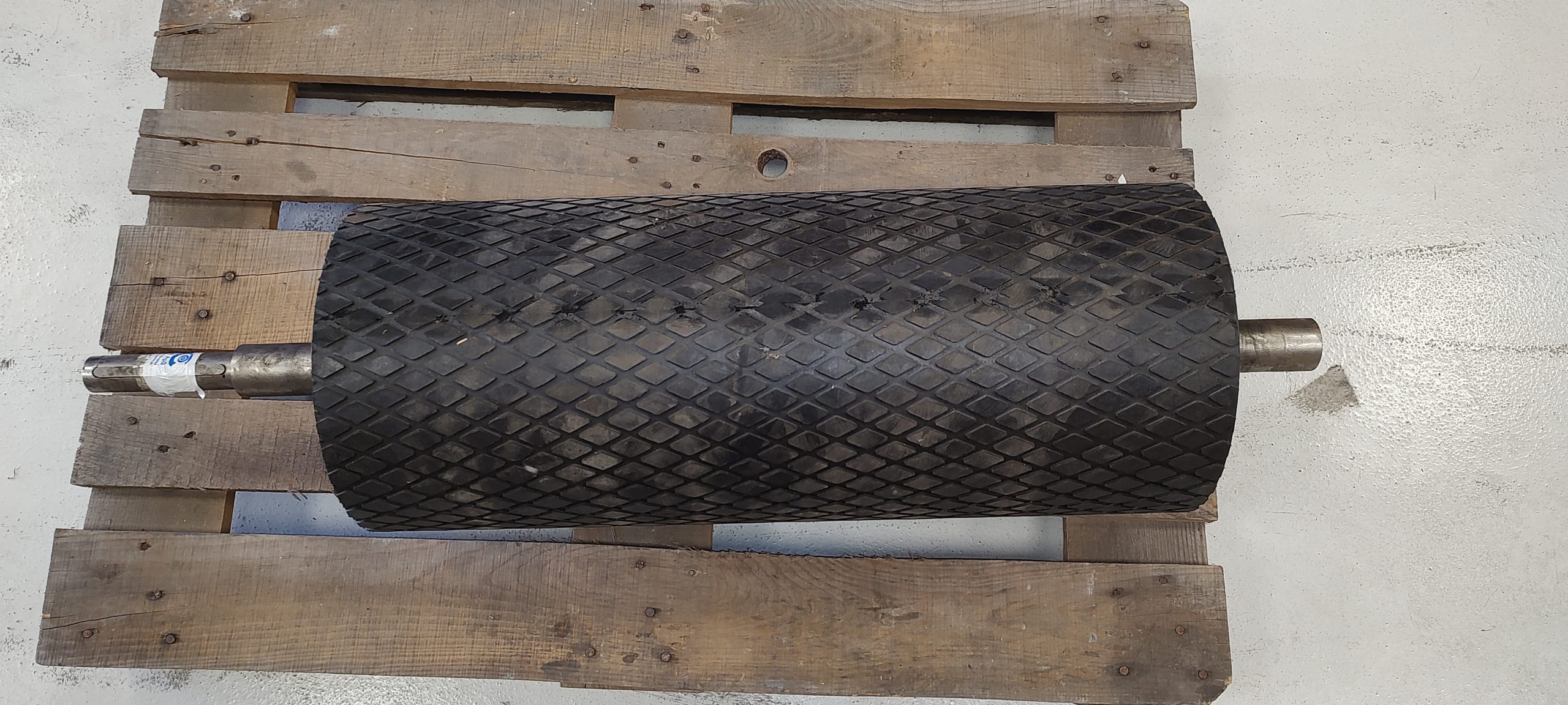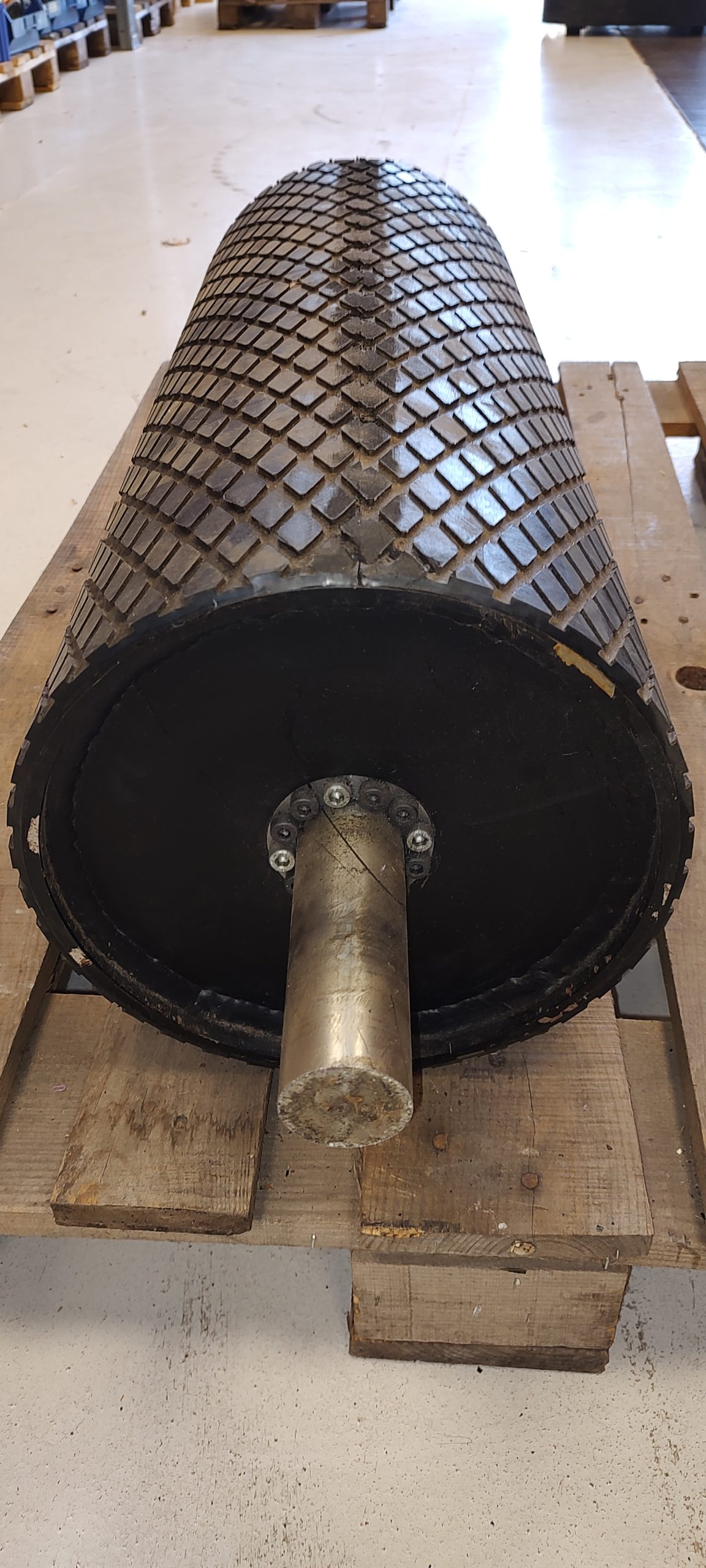 Effektiv træktromle med Ø300 mm diameter og vaffelgummibelægning for optimalt greb og kraftoverførsel i transportbåndssystemer. Tromlen er udstyret med neddrejet aksel og notgang til let montering i drivsystemer.